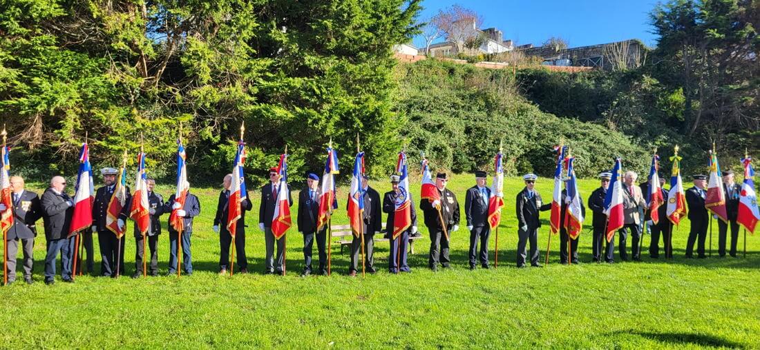 La cérémonie qui a connu un vif succès (200 personnes) réunissait plus de 20 porte-drapeaux dont Jean Claude CRANSAC pour notre section (1er à droite) et Jos LE GALL, secrétaire de notre section, qui portait le drapeau de son père résistant libellé AC PG (Anciens Combattants  - Prisonniers de Guerre )