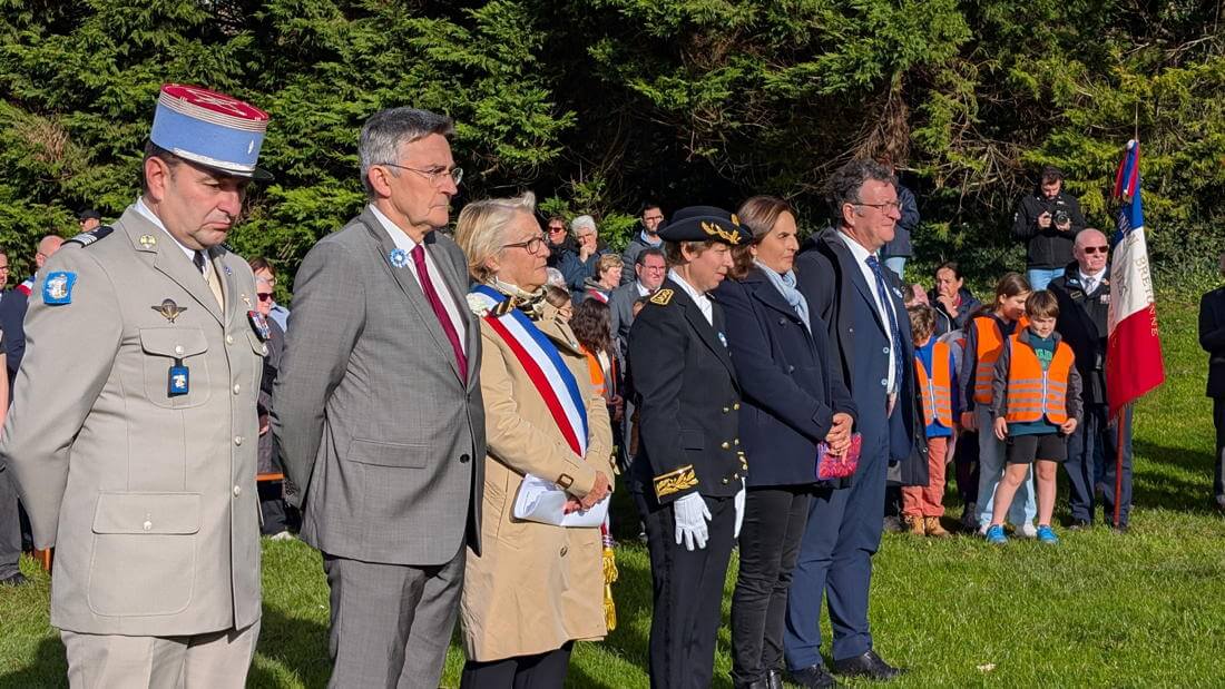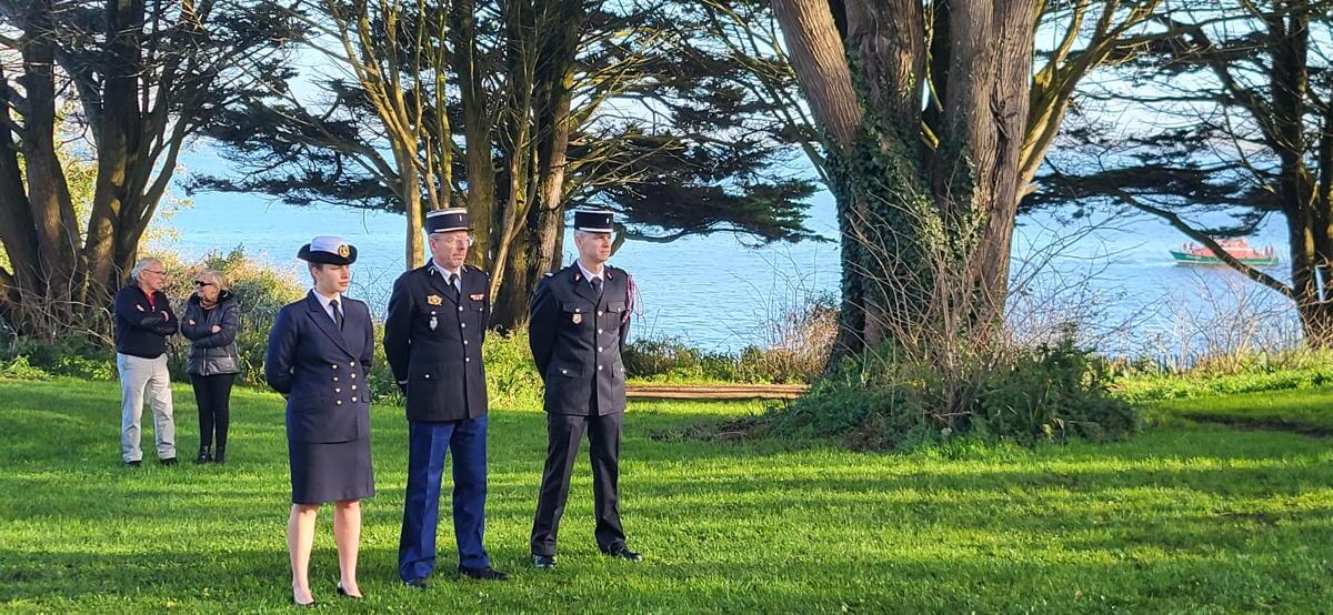 Les officiels présents, de gauche à droite: le colonel Jacques FUMÉ, Délégué Militaire Départemental , M. Didier GUILLON vice président du conseil départemental représentant Maël de CALAN, Mme.Jocelyne POITEVIN, maire de Douarnenez, Mme. Camille DAGORNE sous préfète, chef de cabinet du préfet, Mme. Liliana TANGUY, député, M. Michel CANEVET, sénateur