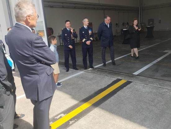 Jean-Luc MINGANT, porte-drapeau du comité, devant un des trois hélicoptères Guépard Marine (H160FI) de la flottille 32F de recherche et sauvetage en mer (SAR : Search and Rescue)